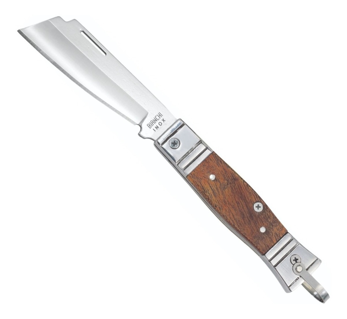 Canivete trad. aluminio/madeira 3 1/4 10102/33 - Bianchi, desenvolvido com lâmina em aço inox 420 de 3 1/4 polegadas. Comprimento da lâmina de 8,5cm, cabo 10,0 cm possuindo um total 18,5 cm.